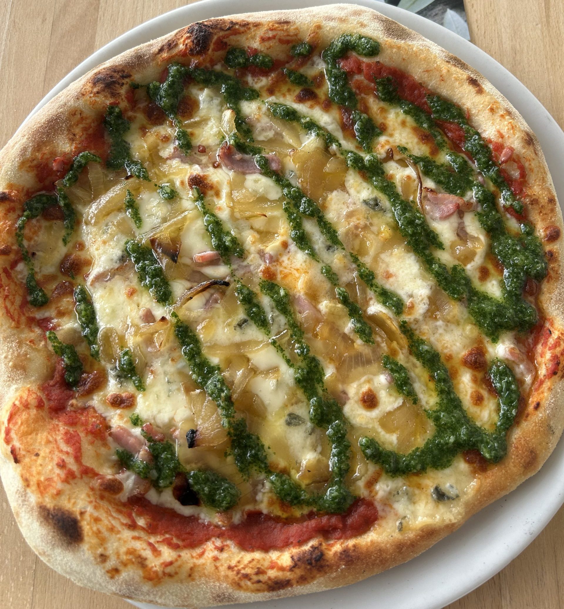 Sauce tomate, Mozzarella, jambon blanc, Gorgonzola, filet de crème fraîche et oignons confits maison.